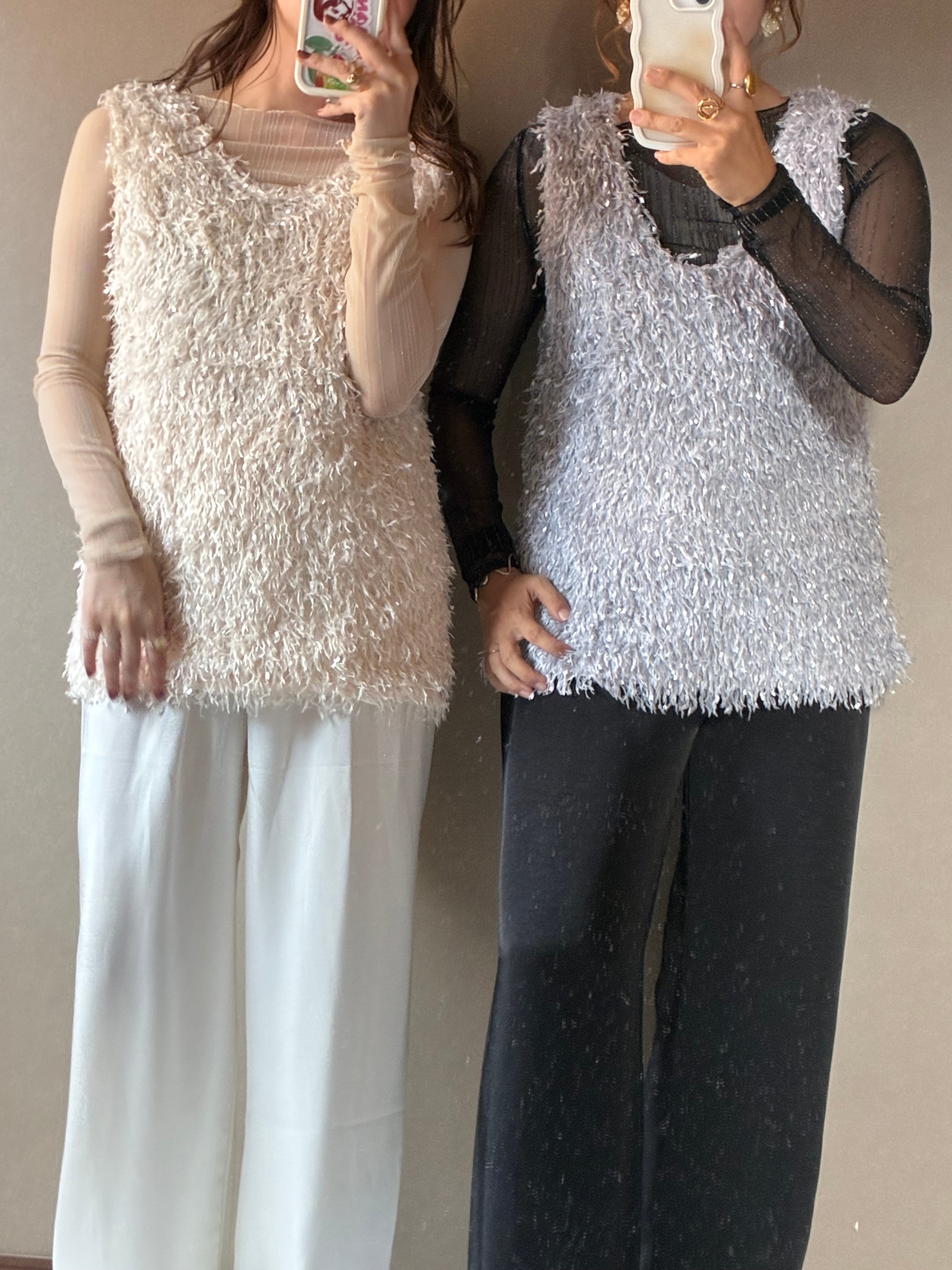 キラキラしていて、ほんのり華やかになれるシアートップス。ぜひジレやベストでレイヤードしてみてくださいね。